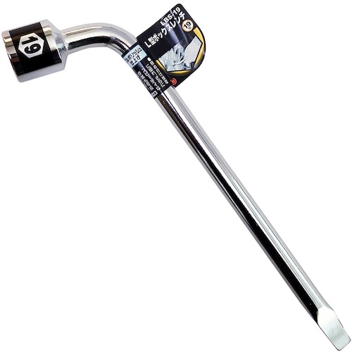 シンプルなL型デザインのホイールナット用ボックスレンチです。先端部はタイヤレバーになっており、ホイールキャップを外す事が出来ます。高級感あふれ、耐食性のあるフルポりッシュ仕上げを採用しました。 |