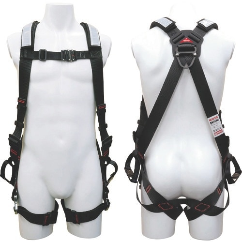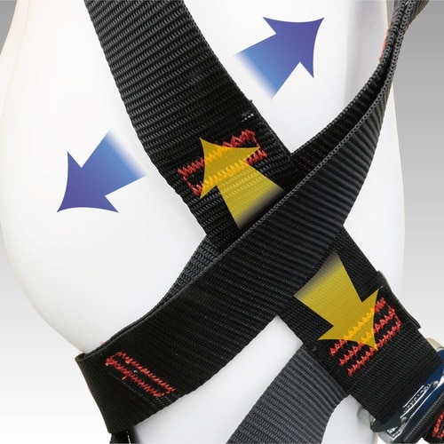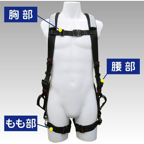 腰のベルト交差部が可動し、身体の動きにフィットします。体格に合わせて胸前・腰・ももの3か所のベルトで調節可能です。骨盤と足回りにベルトを配置しています。電気工事、その他高所作業用。 |