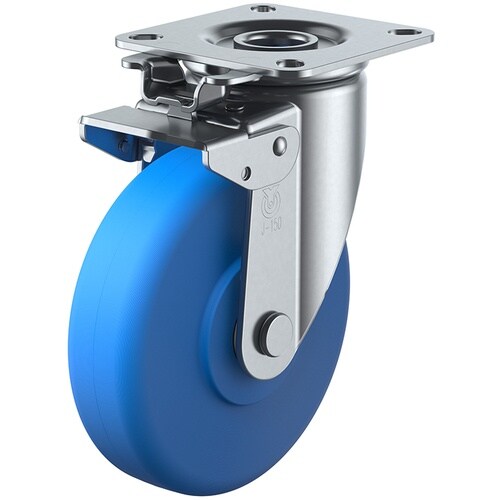 取付ピッチが自在、自在ストッパー付、固定式共に同一です。自在車と固定車の切替がワンタッチで出来ます。カゴ車標準仕様のキャスターです。耐熱性、耐寒性、耐摩耗性に優れたMCナイロン車輪を使用しています。 |