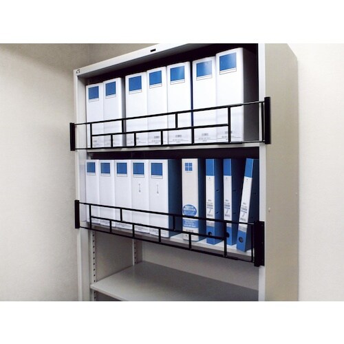書庫内の書類をガードし落下防止が出来ます。スチール製のパイプで重い書類が入っていた場合でも取付可能です。左右合わせて150mm伸縮可能なため様々な書庫に対応できます。書類が横になっても落下しません。 |
