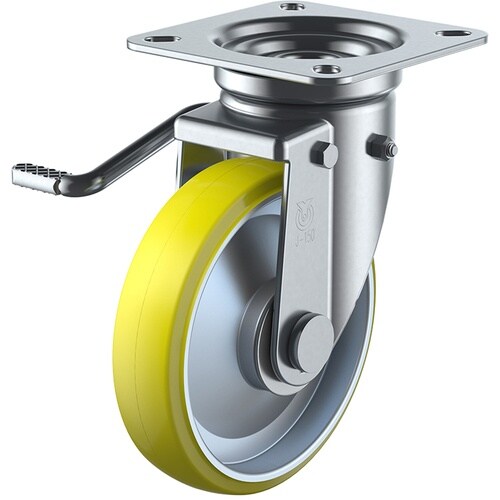 標準的な大型キャスターで、重量物の運搬に数多く使用されています。耐油性、耐摩耗性に優れ、静電気によるチリやホコリの吸着を防ぐ、帯電防止性ウレタン車輪を使用しています。重量物の運搬に。 |