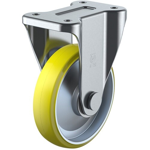 標準的な大型キャスターで、重量物の運搬に数多く使用されています。耐油性、耐摩耗性に優れ、静電気によるチリやホコリの吸着を防ぐ、帯電防止性ウレタン車輪を使用しています。重量物の運搬に。 |