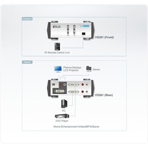 最大2台のDVIソースデバイスを1台のDVIディスプレイに接続/表示することが可です。プッシュボタンとリモコンによる切替に対応です。解像度−最大1920×1200@60Hz、DDC2B準拠です。 |