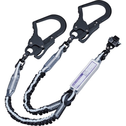 第1種シングルショックアブソーバ付き、2丁掛け伸縮式「じゃばら」ランヤードです。構造物側のコネクタは、剣総アルミフック自在環付きを採用しています。体躯側のコネクタは、ペダルフックを採用しています。 |