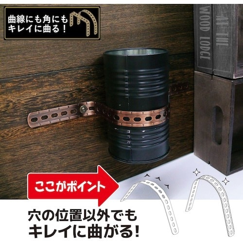 アンティーク調の装飾性の高い金物で、リブがはいっているのでキレイに曲げられます。好みの長さでキレイに曲げ加工でき、穴の位置以外でもキレイに曲がります。
