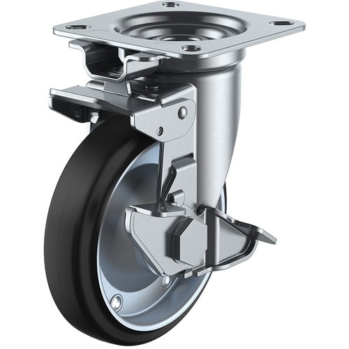 標準的な大型キャスターで、重量物の運搬に数多く使用されています。自在車と固定車の切替がワンタッチで出来ます。走行性に優れ、静電気を除去することができる導電性ゴム車輪を使用しています。重量物の運搬に。 |