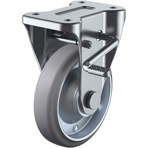 標準的な大型キャスターで、重量物の運搬に数多く使用されています。走行性に優れ、床面に走行跡を残しにくいグレーゴム車輪を使用しています。重量物の運搬に。 |