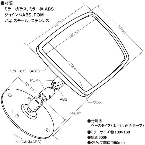 幅(mm):160 | 奥行(mm):70 | 高さ(mm):142 | 像大きさ(曲面R):300 | 付属品:木ネジ、両面テープ | 単位:1個