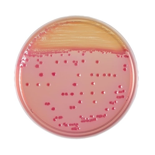 CIN 寒天培地は、検査材料からのYersinia の選択分離培地です。Y. enterocolitica は24−48時間培養で本培地上に平滑、赤色、湿潤でやや膨隆、コロニーの周辺が白色をおびた特徴 |