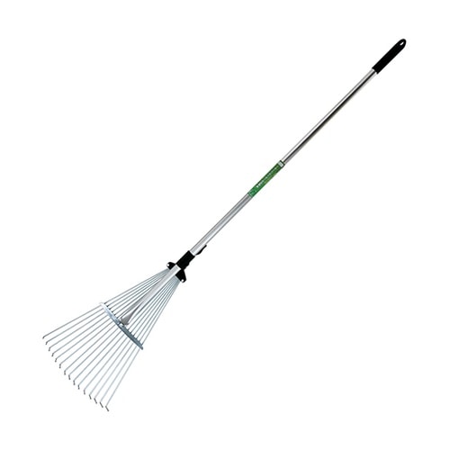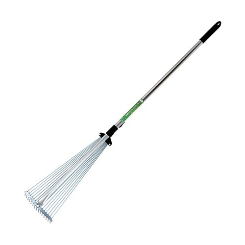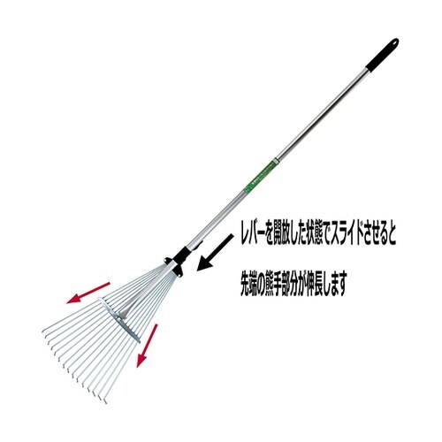 15本爪の先端が丸い形状で土に刺さりにくい22φアルミパイプ使用で軽く使いやすい全長が1270mm−1570mmに伸びる爪幅190mm−510mmに広がる |