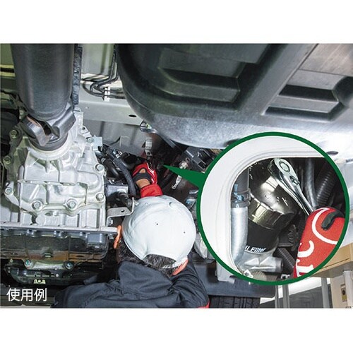 特殊形状オイルフィルタに対応した専用形状。内周の山部(突起)が対面に存在しない設計で、かみ込み力を分散。浅がかりしない最低限の高さ44mmに設定。パワーフィット形状の採用で差込角からの破損・亀裂を防止 |