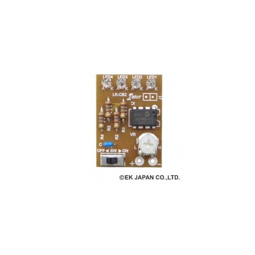 LEDが流れる方向を選べてスピードを簡単調節できる、LED点灯基板キットです。★赤色LED(φ3mm)が4個付属しています。★組み込みしやすい小型基板です。★違う発光色のLEDに交換できます。4つのL |