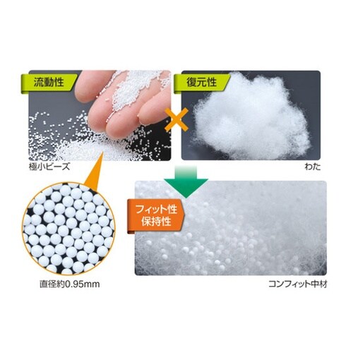 多様な形状を取り揃え、ポジショニングの目的に合わせて選択できます。中材に、流動性に優れた「極小ビーズ」と復元性に優れた「わた」を適正なバランスで配合し、フィット性と保持性を両立しています。表地には蒸れ