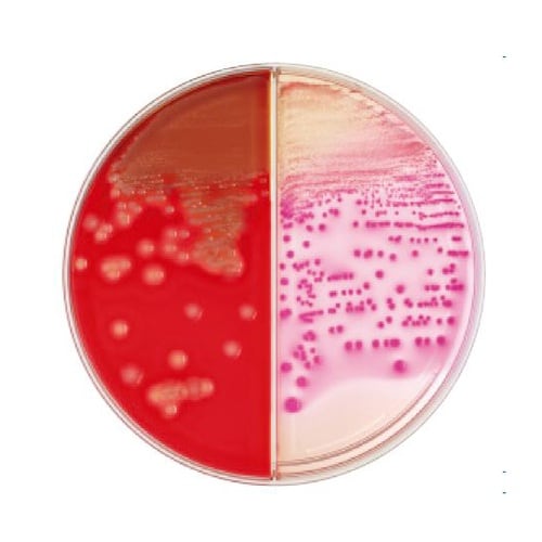 本培地は、1枚で2種類の培地が併用できる様に組合わされた便利で効率の良い培地で、発育性、溶血反応にすぐれた一般分離用TSA II5%ヒツジ血液寒天培地と、グラム陰性桿菌の選択分離にすぐれたマッコンキー |