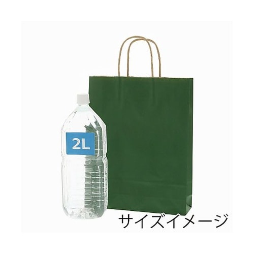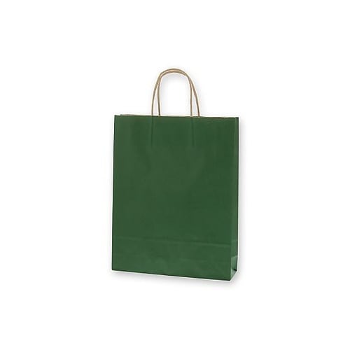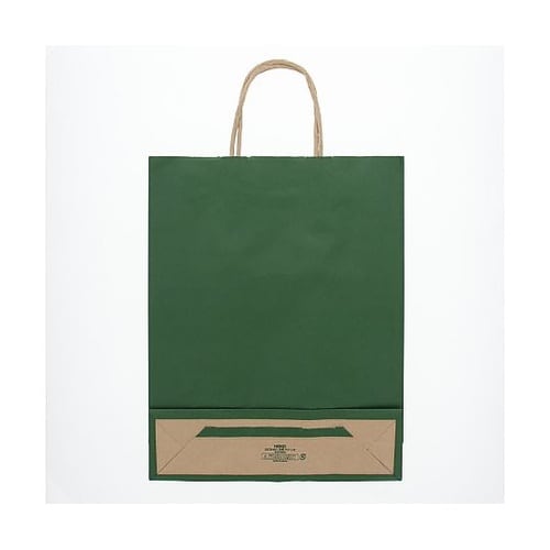 クラフト紙に緑ベタを印刷した手提げ紙袋です。色落ちを緩和させるために、上からニスを塗布しています。A4サイズの収納に適した規格です。 |
