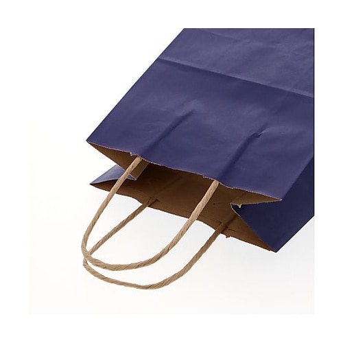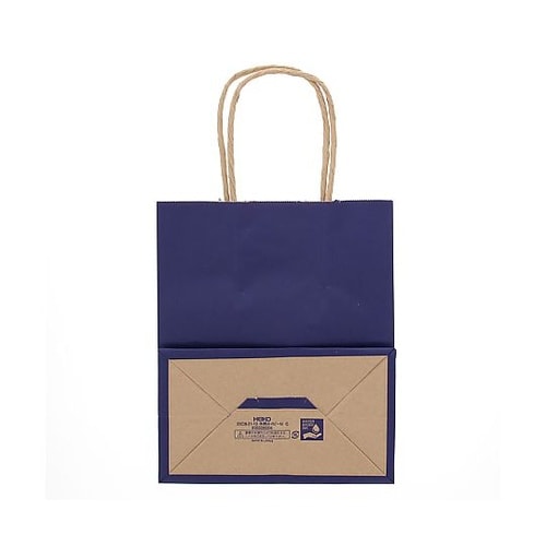 クラフト紙にネイビー色のベタを印刷した手提げ紙袋です。色落ちを緩和させるために、上からニスを塗布しています。コンパクトな人気のサイズで、雑貨・文具・コスメ・菓子などに。 |