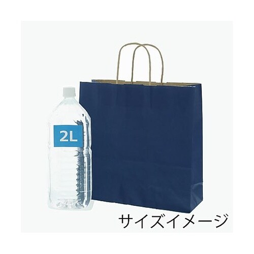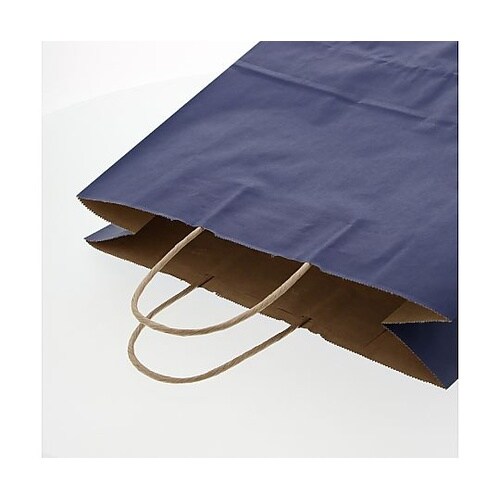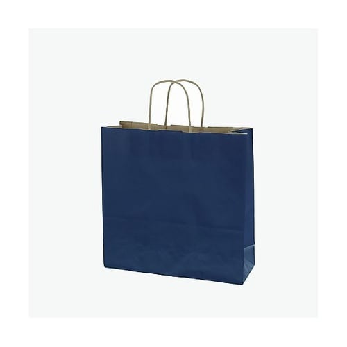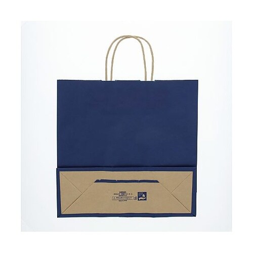 クラフト紙にネイビー色のベタを印刷した手提げ紙袋です。色落ちを緩和させるために、上からニスを塗布しています。幅と高さがほぼ正方形のオールマイティモデル。 |