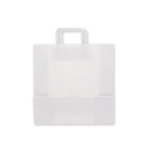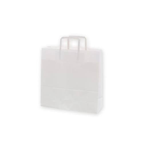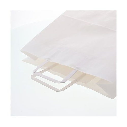 もっとも汎用性の高い、プレーンな白無地の手提げ袋です。未使用時には紐が飛び出ていないため、在庫スペースにやさしい平紐タイプです。縦長のスタンダードサイズ。 |