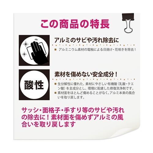ハウスクリーニングのプロが「汚れた素材・場所の種類」、「汚れの原因」に応じて開発した高性能クリーナー。「驚きの洗浄力」でこれまで中性洗剤では落ちなかった屋外アルミ製品の汚れを落とします。研磨剤を含んで |