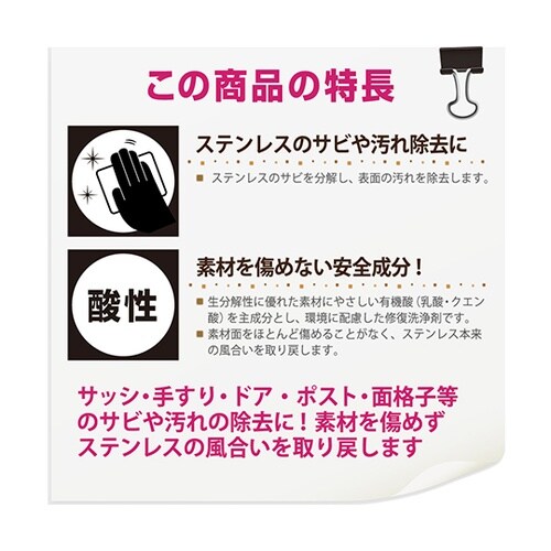ハウスクリーニングのプロが「汚れた素材・場所の種類」、「汚れの原因」に応じて開発した高性能クリーナー。「驚きの洗浄力」でこれまで中性洗剤では落ちなかった屋外ステンレス製品の汚れを落とします。研磨剤を含 |
