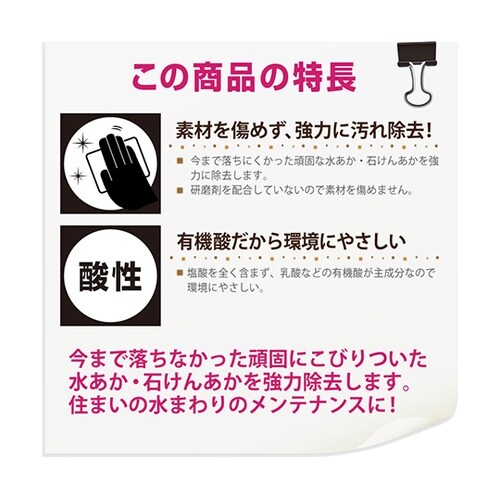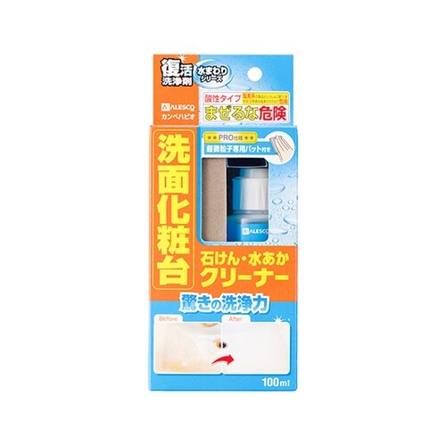 ハウスクリーニングのプロが「汚れた素材・場所の種類」、「汚れの原因」に応じて開発した高性能クリーナー。「驚きの洗浄力」でこれまで中性洗剤では落ちなかった洗面化粧台の水あか・石けんあか汚れを落とします。 |