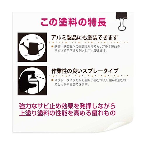 乾燥が速く、作業性抜群のサビ止めスプレーラッカー・水性塗料・油性塗料が上塗りに塗装できます。 |