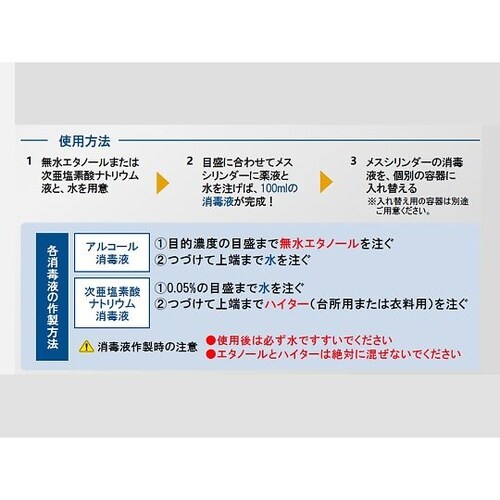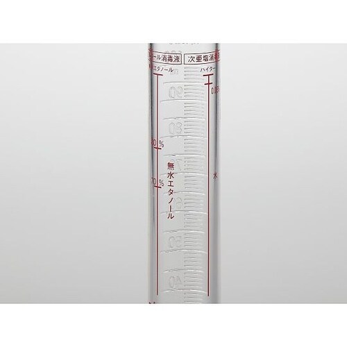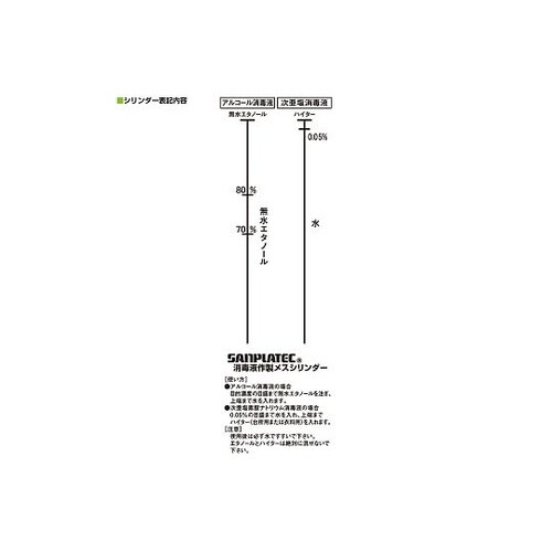 エタノール消毒液70%、80%、次亜塩素系消毒液0.05%の作製に対応しています。目盛位置に合わせて薬液と水を入れるだけ。手作り消毒液の計量をスムーズに。耐薬性のあるTPX(R)(ポリメチルペンテン) |