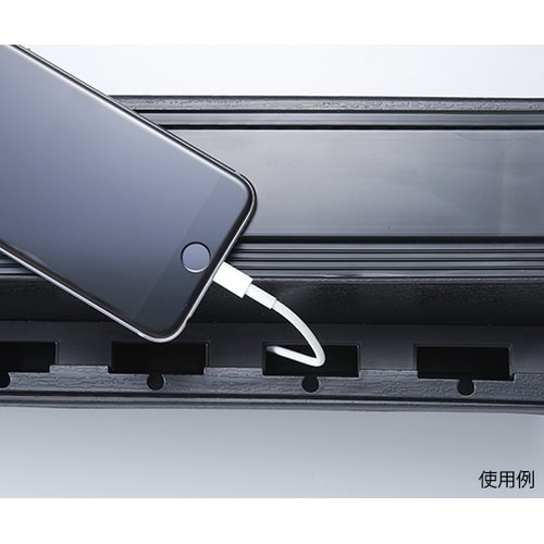 ごちゃつくタップとコードをすっきり隠して、充電スペースに。充電プラグを引っかけられるケーブルフック、天面にはタッチペンなど小物を置ける溝付。厚さ17mmまでのスマホ等が置いたままで充電できるスペースあ |