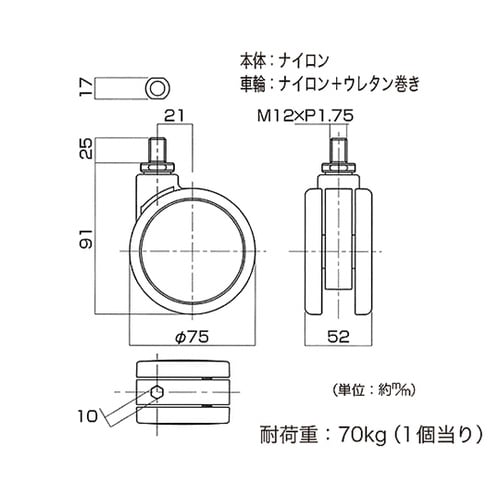 ハイロジック フォルテキャスター 75mm M12ボルト・ストップ付 A052-6057