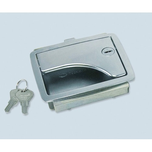 扉の開閉は、レバーを引くことによって開き、扉を押すだけで閉まるワンタッチ操作です。また、ラッチが相手側に収まっていない時は、レバーが浮いた状態になるので扉のロック様態を目で確認できる安全重視の設計です |