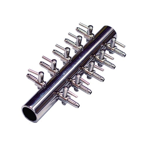 たくさんの水槽を維持する方に、エアーの分岐に便利なステンレス10方コックです。各水槽へ送るエアーの量を調節することができます。 |
