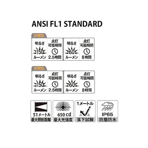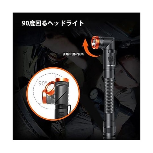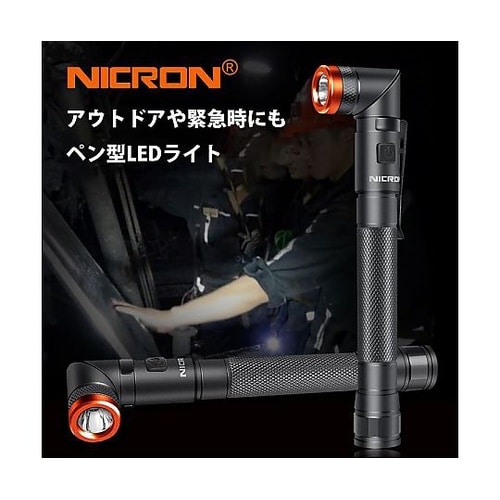 リチウムイオン充電池内蔵。単4電池×2本(別売)でも使用可。強力マグネット×無段階90°ツイスト首振りスリムペン型明るさ150ルーメン(2.5時間)60ルーメン(8時間)IP65レベル防水防塵最大照射 |