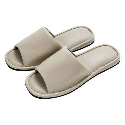フェイクレザーで高級感があり、厚みがあるため歩きやすいスリッパです。前あきなので通気性抜群です。滑りにくく、来客用にも最適なスリッパです。来客用として。足のムレを気にされ方に。