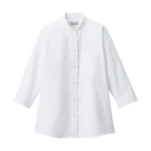 幅広いシーンで活躍する、定番ブロード生地のレディススタンドカラー七分袖ブラウス。左胸アウトポケット付き。防シワ防汚 |