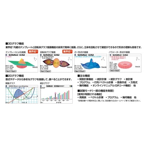 鮮やかなカラー液晶、3Dグラフの描画、解析機能を搭載しています。内蔵されたテンプレートと回転体グラフ描画機能の採用で、3Dグラフを簡単に描画できます。立体を回転させて様々な角度から確認できるので形状の |