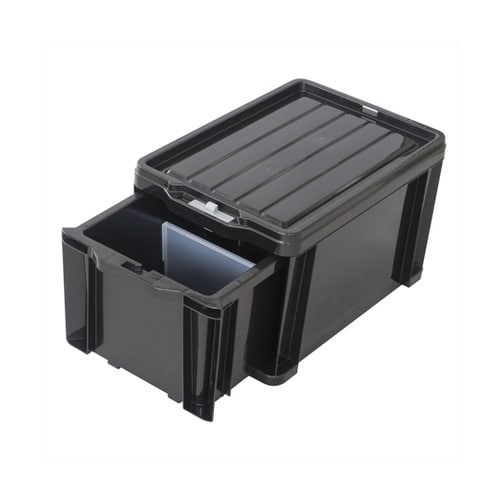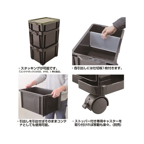 引き出し手前には「飛び出し防止ロック」付き。ボックス底面には積み重ね時の転倒防止用に「積み重ねロック」付き。引き出しを引き出せばそのままコンテナとしても使用可能。各引き出しには小分けに便利な仕切版1枚