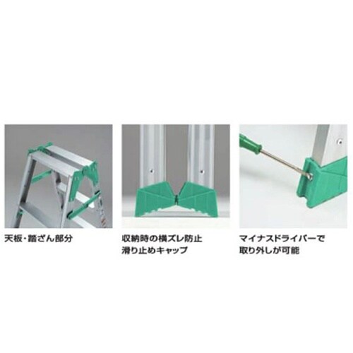 両面幅広踏ざん60mm!ピカのフラッグシップモデル。脚立時でもはしご時でも昇降しやすい両面幅広踏ざん(60mm)になりました。収納時の横ズレ防止、滑り止めキャップ。マイナスドライバーで取り外しが可能。 |