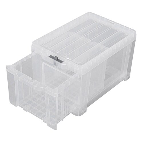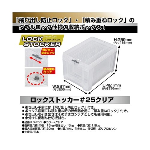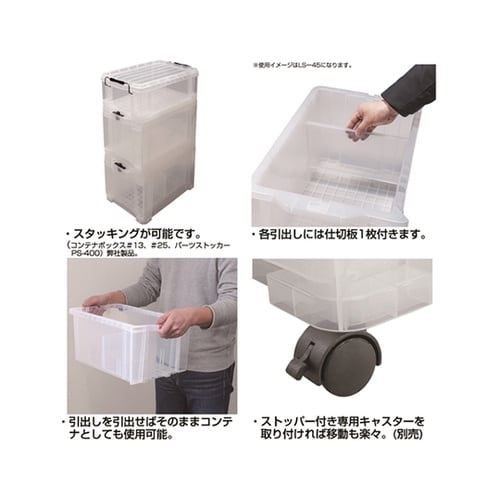 引き出し手前には「飛び出し防止ロック」付き。ボックス底面には積み重ね時の転倒防止用に「積み重ねロック」付き。引き出しを引き出せばそのままコンテナとしても使用可能。各引き出しには小分けに便利な仕切版1枚 |