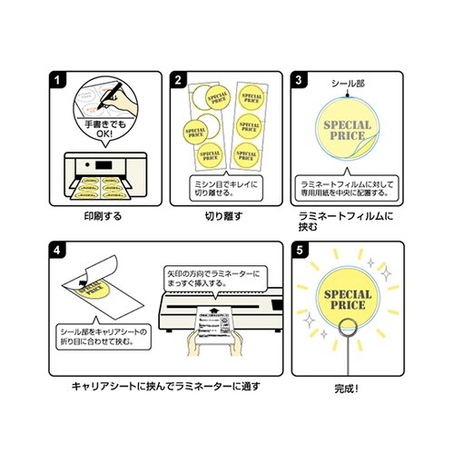 ハサミ、カッターは不要!オリジナルのラミネートPOPがカンタン・キレイに作成できます。専用用紙と型抜きラミネートフィルムがセットになったPOP作成キットです。