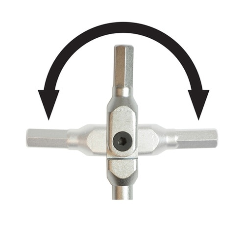 ヘッドが180°曲がるので障害物のある場所でも差し替えせずに連続締め付けが可能です。表面処理には特殊なマットクロム仕上を採用しており、腐食を防ぎます。六角穴付ボルトの締め付け、緩め作業に。 |