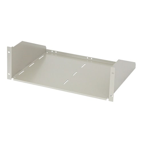 19インチマウントタイプの収納棚でJIS規格に準拠しています。棚面の長丸穴を利用すれば、機器固定ベルト(RAKB−0200A)による簡易固定が可能です。ラック内へ機器等が落下しないように、後ろ側の折り |