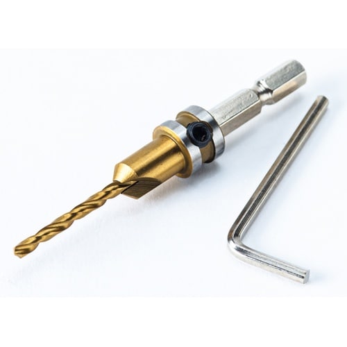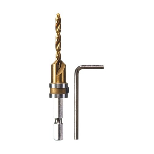 ビスの皿取り、埋め込みの下穴あけが一度にできる。業界初、オールハイス鋼の皿取りドリルなので永持ち、チタンコーティングで更に永持ち。先端ドリルの長さは、3段階調整できます。 |