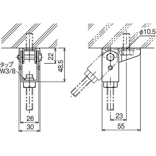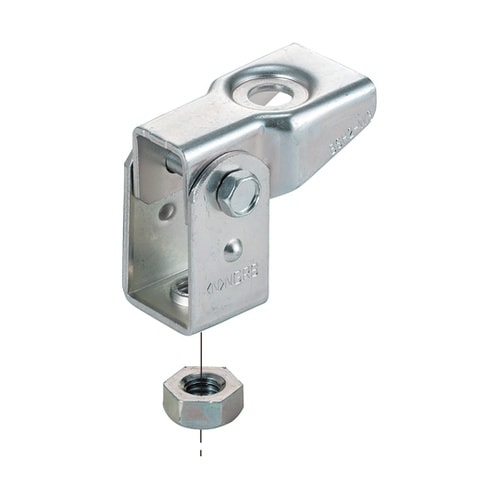 天井、壁面から吊りボルトを斜めに下げられます。六角ボルトと工具(ソケット)が干渉しないため、金具を組み立てた状態で施工できます。振れ止めボルトの支持に使用できます。 |