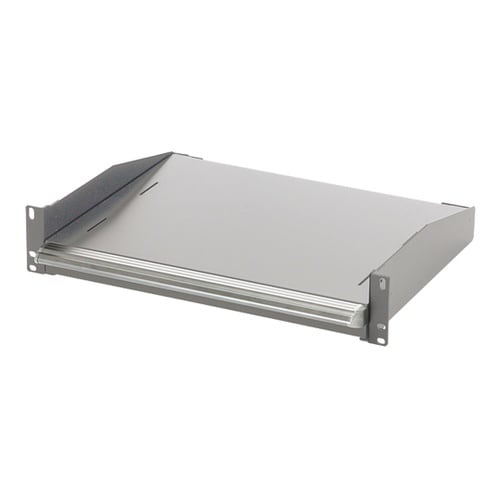 棚面がスライドできる19インチマウント型の収納棚で、EIA規格に準拠しています。JIS規格のラックにも取り付けできるように、取り付け穴を設けています。ラッチが確実に棚をロックする為、地震やラックの移動 |