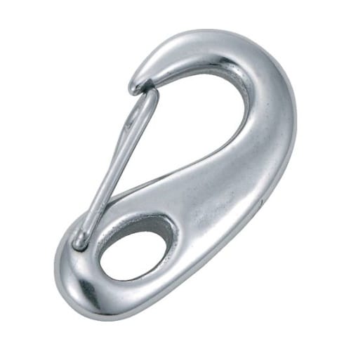 ばね状のリング部分を押し込むことで開閉することができます。フック部とチェーン・ロープを入れる部分が分かれています。チェーン・ワイヤ・ロープなどの吊り具としての端末金具、ジョイント金具に。 |