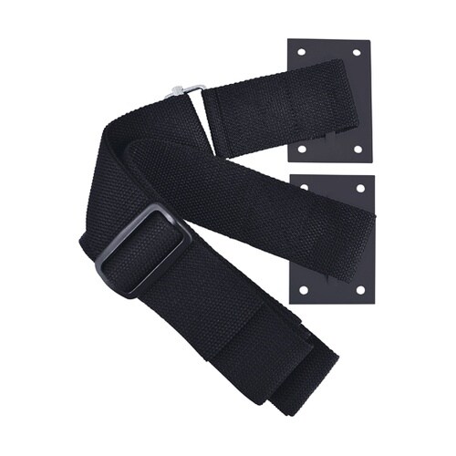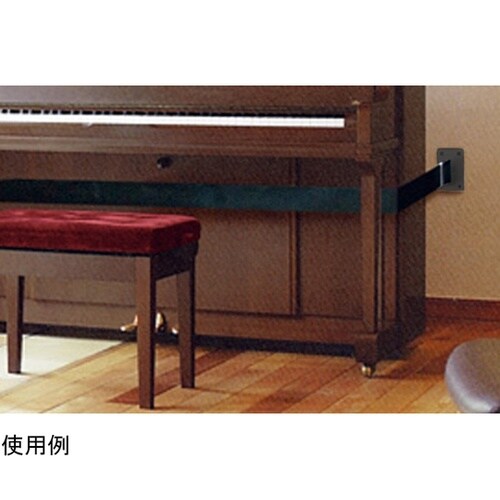 アップライトピアノや電子ピアノの転倒防止金具をピアノの両脇に粘着固定・ビス固定で設置し、50mm幅のベルトでしっかり固定 |