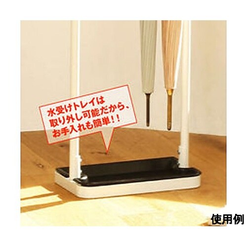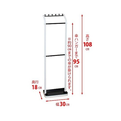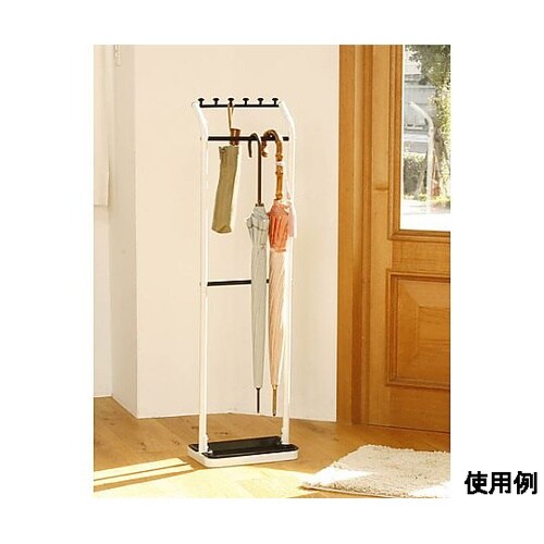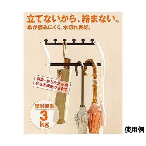 約90cmまでの傘がかけられます。立てないから、傘がからみにくく、水切れも良好です。水受けトレイは取り外し可能でお手入れも簡単。フックとハンガーに傘を各6本収納できます。 |