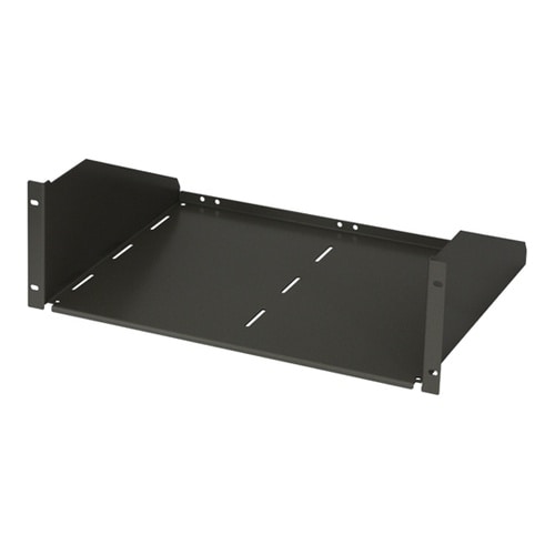 19インチマウントタイプの収納棚でJIS規格に準拠しています。棚面の長丸穴を利用すれば、機器固定ベルト(RAKB−0200A)による簡易固定が可能です。ラック内へ機器等が落下しないように、後ろ側の折り |