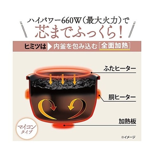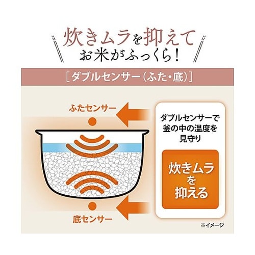ごはんがおいしく炊けるように、火加減を2つのセンサーで見張る「ダブルセンサー(ふた・底)」強い火力で炊き続けられる蒸気口付立つしゃもじ付2.5mmの黒厚釜でふっくら炊き上がります。炊飯時の中パッパ工程 |