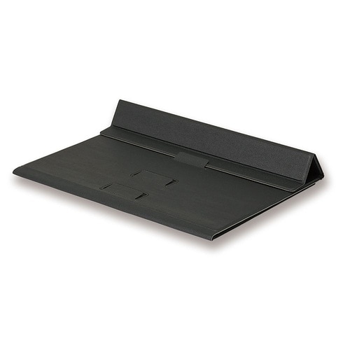 デスクマット付きモバイルスタンド。PCやタブレットに使用できます。デスクマットを手前に倒したり折り返すことで、ノートやメモをとれる筆記マットに早変わりします。 |